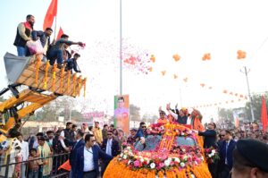 इससे पूर्व माननीय मुख्यमंत्री धामी ने त्रिशूल चौक का लोकार्पण किया उससे पूर्व उन्होंने कांवरियों की पैर पखारे एवं उनको अंगवस्त्र व पुष्प माला भेंट कर उनका अभिवादन किया इसके उपरांत त्रिशूल चौक से सरस मेला कार्यक्रम स्थल गांधी पार्क तक आयोजित शिव बारात में प्रतिभाग किया। शिव बारात में माननीय मुख्यमंत्री का विभिन्न संगठनों व जनता द्वारा फूलमाला,पुष्पवर्षा कर भव्य स्वागत किया।